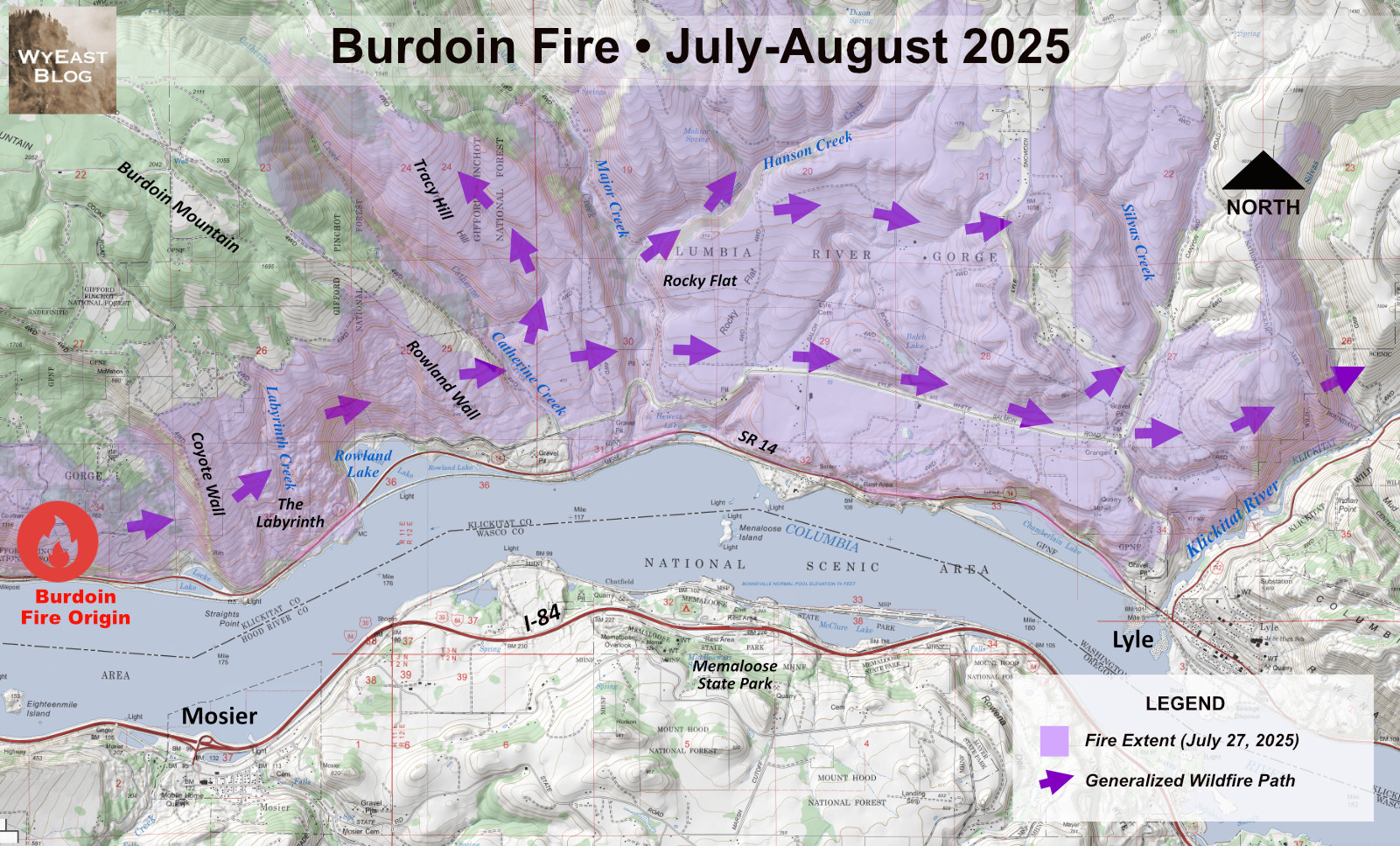 On just the second day, the fire had roared into the Catherine Creek area and was now threatening the town of Lyle, a full seven miles upriver from its origin. That day, the Klickitat County Sheriff issued a Level 3 “Go now!” order and the town and surrounding area were evacuated. More than 900 wildland firefighters would eventually be on the ground over the next two weeks to help contain the blaze. The map below shows the general path of the fire over the days that followed.