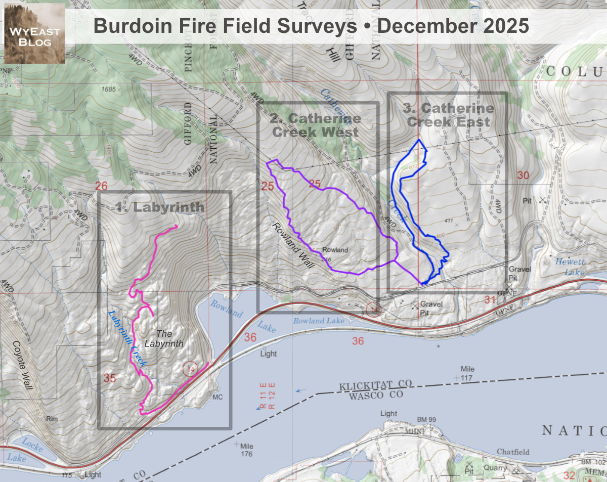 This first installment examines the west end of the fire, nearest its origin, where it burned across the area known as the Labyrinth. The second installment will focus on open savannah country between the Rowland Wall and Catherine Creek, and an area that had already burned in the fall of 2024. The third installment will survey Catherine Creek canyon and the burned savannah areas to the east of the canyon. The trail routes followed for each survey are also shown on the above map. The photos for these tours were taken in December 2025.
