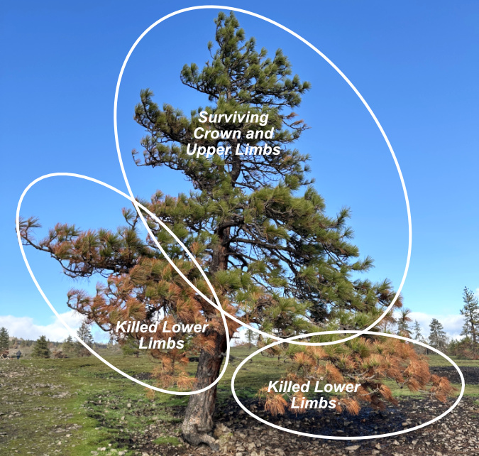 There’s a benefit to sacrificing low-hanging limbs that is an evolutionary adaptation for fire-dependent conifers like Pondersosa pine, Western larch and Douglas fir. By shedding lower limbs over time, whether through exposure to fire or simply aging, they reduce the risk of these limbs providing a “ladder” for intense fires to climb into the crown of a tree, which it is much less likely to survive. Their fire-adapted thick bark, especially on older trees, helps protect the trunk against all but the hottest fires.