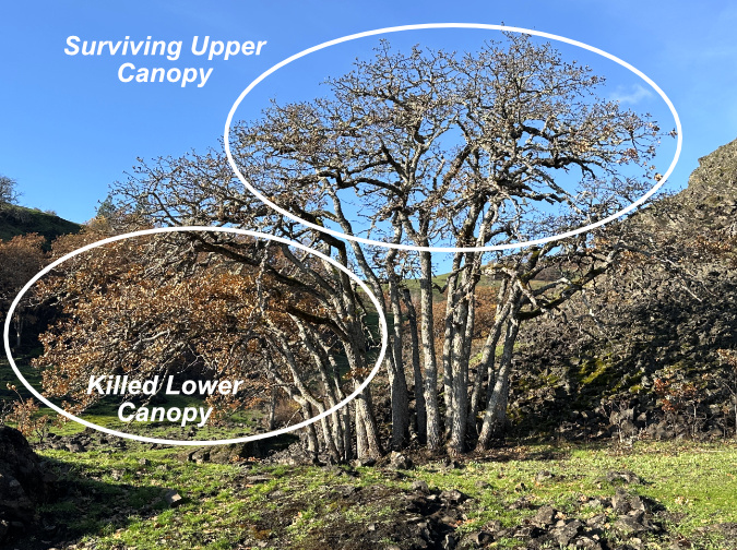 For deciduous trees in the dry East Gorge, like the dominant Oregon white oak and occasional Bigleaf maple, the visual impact of fire in the months after a burn can be counter-intuitive. With most fires occurring in the dry summer months, the immediate impact is browned leaves left hanging on scorched limbs, killed by the heat but not completely burned away. In fall, healthy leaves on surviving trees will turn color and drop naturally, following their annual cycle.