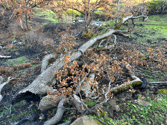 Understanding what survived on deciduous trees in the first winter after a fire is counter-intuitive, as the burned limbs and trees typically don’t drop their leaves in fall.