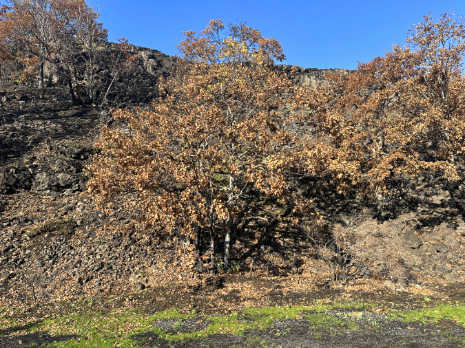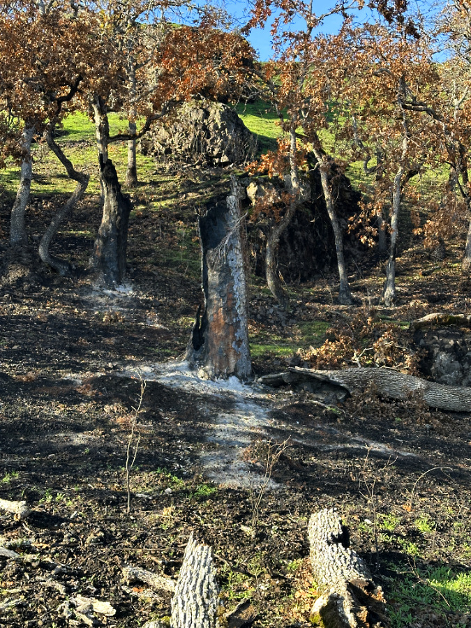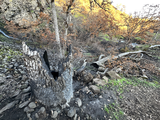 Like most of the fire-impacted oaks, we won’t know for sure if this big tree has survived until spring. The fire burned hot enough here to completely clear the understory and all debris, right up to the rocky outcrop beyond the tree, leaving a burn scar on the tree’s trunk in the process. However, its limbs do seem to have sprouted some late season growth, giving a hint that it will survive largely intact, ready to bump more hiker heads for years to come.