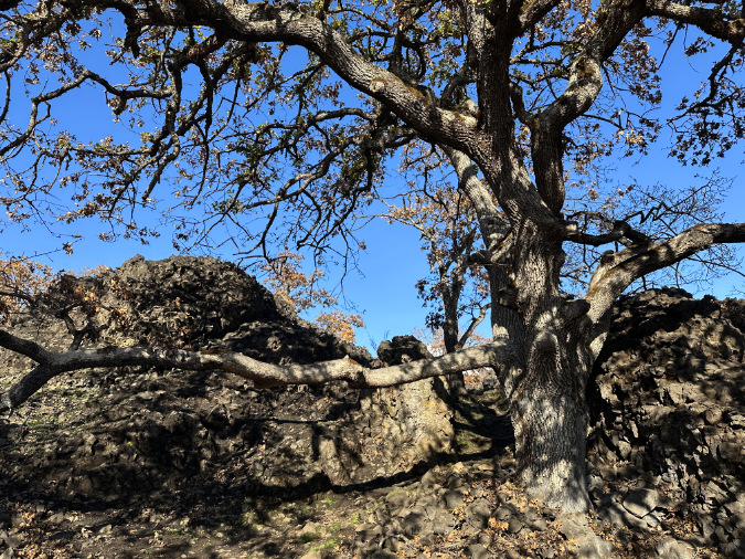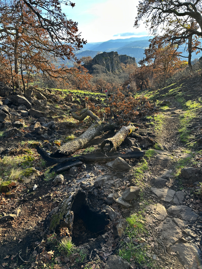 The basalt mesa known to hikers as Accordion Rock rises above a burned landscape in the Labyrinth. Bright green grasses and meadow wildflowers had already begun to emerging by late November, just four months after the Burdoin Fire had burned through. The Oregon white oak trees in this view aren’t showing fall color; instead, these are leaves killed by the fire and left hanging long after healthy oaks have dropped their leave and entered winter dormancy. We won’t know the full impact of the fire on trees like these until spring.