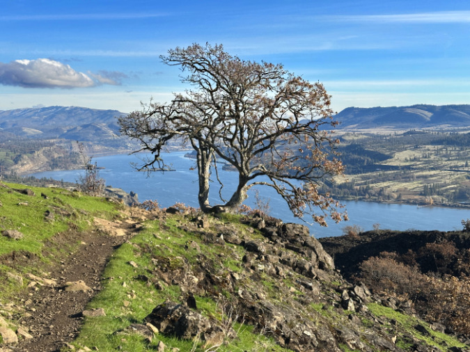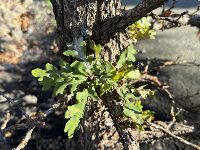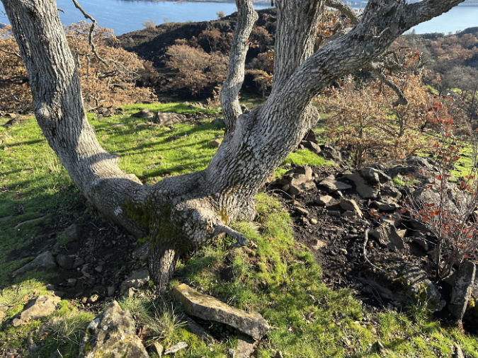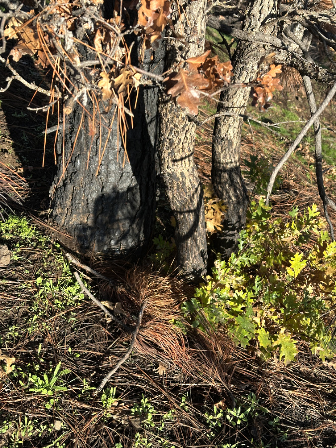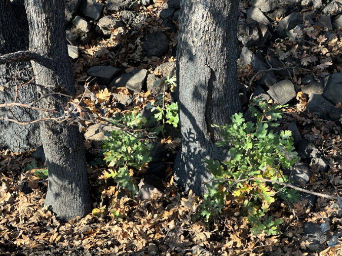 …a pair of young oaks sharing space with the pine are already pushing up new shoots from their surviving roots, a super-power that allows oaks to quickly bounce back after fire in the East Gorge..
