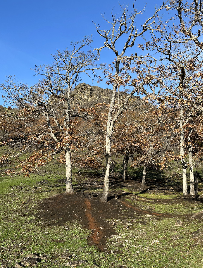 It’s hard not to become attached to iconic trees, and this picturesque twin-trunked oak at the top of the Labyrinth is a sentimental favorite to many. Though the fire swept through here, this fine tree seems to have survived… though we won’t know for certain until spring foliage appears.