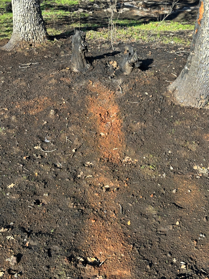 This close-up view of the previous image shows a rusty stripe within a larger bare patch extending from a burned-out stump – all are telltale signs that a tree that was downed in the fire (or perhaps already on the ground), and burned long and hot here. The lingering embers burned hot enough to turn brown, living soil into red, mineral soil, marking where the fallen tree trunk lay. The surrounding, darker soil marks the area where the fire had sufficient fuel to burn long enough to kill the roots and seeds of understory plants that are otherwise rebounding around this cleared patch.