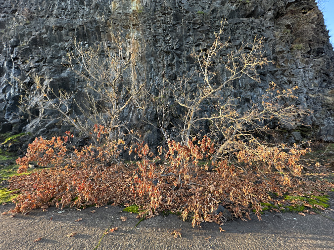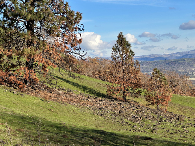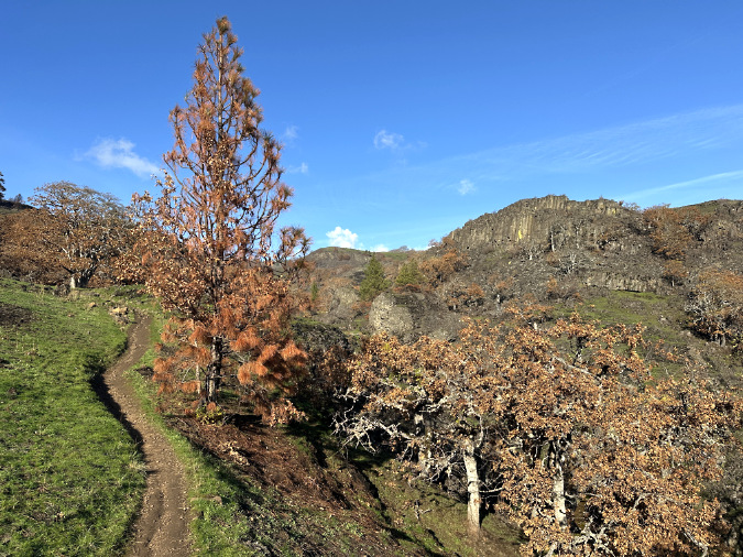 Bigleaf maple aren’t common in the East Gorge, though they thrive in niche locations along cliff walls and protected gullies that produce groundwater seeps and concentrate stormwater sufficient for them to live in this desert climate. This Bigleaf maple clearly lost its lower limbs to the fire – those still covered in scorched foliage – but its upper limbs lived to shed their foliage normally in the fall, suggesting the fire move fast and low here, allowing the main trunk and upper limbs to survive.