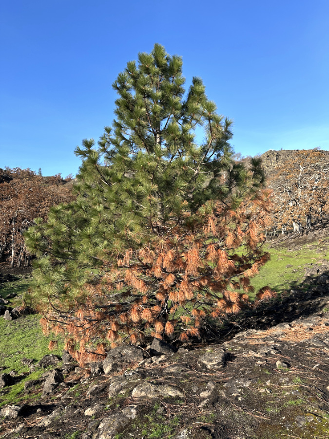 With Ponderosa pine it’s easy to see where fire has killed limbs or whole trees simply by where green foliage remains a few months after a fire. Sometime conifers can produce new growth from limbs whose needles were browned or even burned off by fire, but usually they sacrifice these limbs and focus their energy on green, healthier limbs.