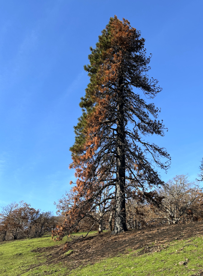 …the entire east side of its canopy burned, nearly to the top of the tree, providing an example of the ladder effect on large trees that retain limbs within the reach of fire. The fact that this tree had low limbs also suggests that it has not faced a wildland fire in its many decades of growing here, if ever. Though this tree lost at least half of its canopy, the crown is intact and the tree stands a good chance of slowly recovering over time.