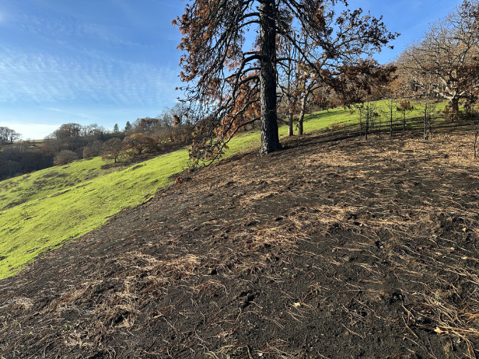 In the upper meadows above the Labyrinth, the oaks are much larger, thanks to deep soils above the flood-scoured Labyrinth. However, the better soils here and an absence of fire in recent years also contributed to an overgrown understory and accumulation of debris that completely burned away in the fire. We’ll know in the spring if the heat from this intense burning was too much for these big groves to survive.