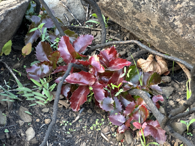 These emerging Oregon grape stems are surrounded by wildflowers and grasses that are also recovering quickly throughout the Labyrinth.