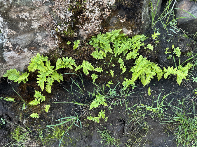 Ferns in the Labyrinth are mostly dormant in the dry months, dropping their foliage when the summer drought begins, then re-emerging for the winter months when rains return in fall. This timing worked well for these Polypodium ferns, whose underground rhizomes survived the heat and are already pushing up another season of winter fronds.