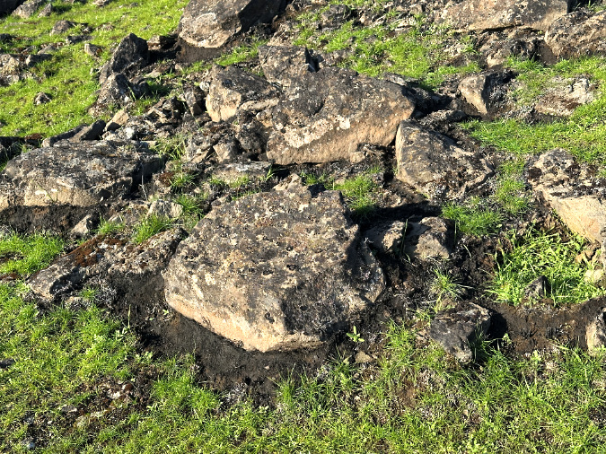 One of the surprising effects of fire in the East Gorge is how meadow rocks superheat from the flame, holding their heat long enough to kill the roots and seeds in the soil around them. This ring-of-death effect is common throughout the open savannah areas of the Burdoin Fire.