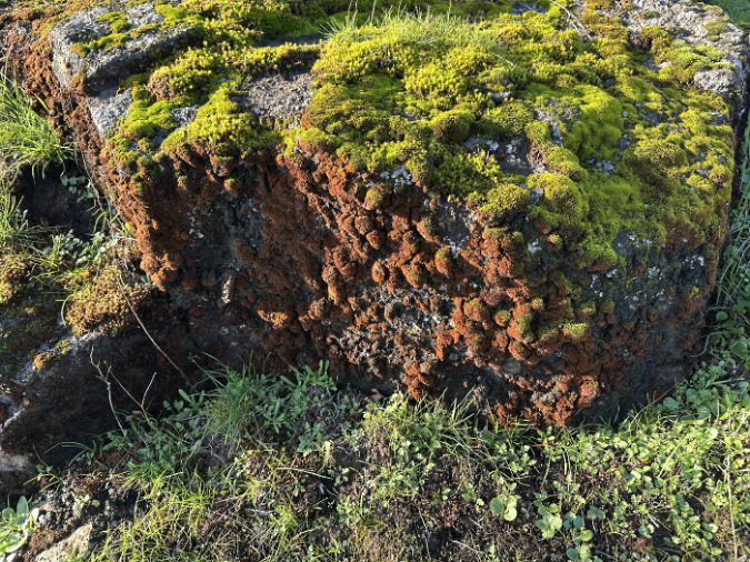 The moss on this large boulder tells a unique story: the fire burned low and fast here, enough to kill the moss on the 2-foot high face of the boulder, yet not sweep over it – and not hot enough to kill the roots and seeds in the soil that are already emerging.