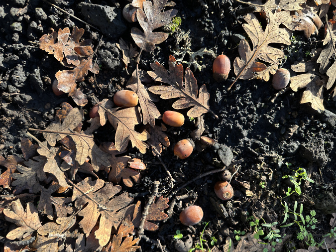 A sign of new growth to come in spring, healthy, fallen leaves and fully developed acorns give reason for optimism that the head-bumping oak will leaf out once again this spring.