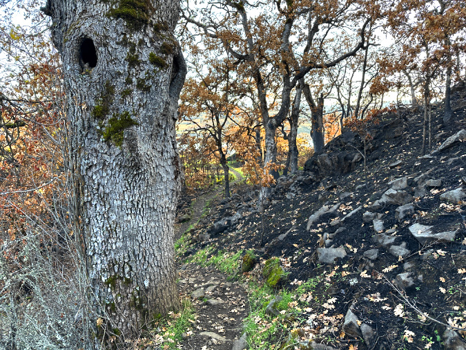 A second iconic giant is just a few dozen yards uphill from the first big oak, and it fared quite well. As you can see in this image (below), the trail served as a fire break of sorts, and this very old tree seems to be largely untouched by the flames — though the heat many have scorched some of its lower limbs that hang above the blackened area on the slope to the right.