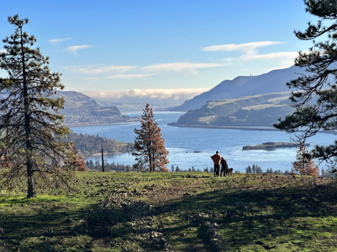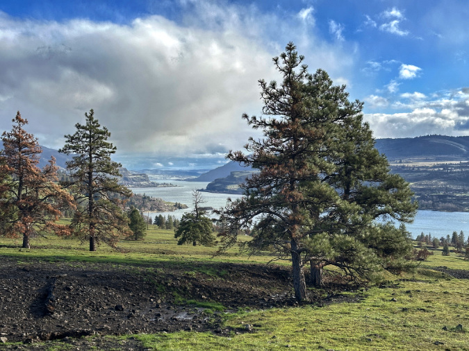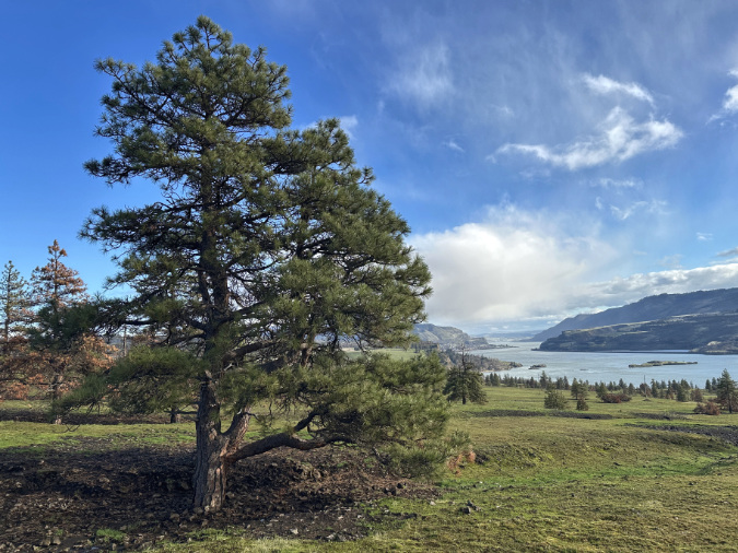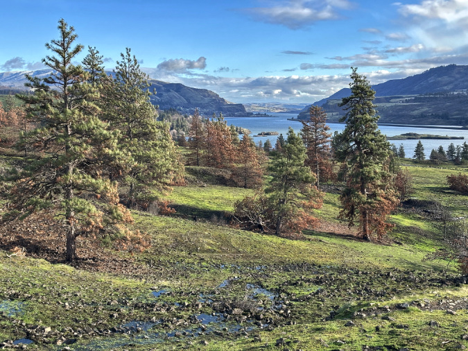 You can easily spot the high-water mark of the ice age floods in this part of the Gorge. Just a hundred feet uphill from the viewpoint where the previous photo was taken, the terrain suddenly softens into the rolling slopes that make up the Columbia Hills (below). There’s plenty of jagged basalt here, too, but it’s mostly buried under millennia of soil accumulation that survived the floods thanks to being mainly above the flood levels.