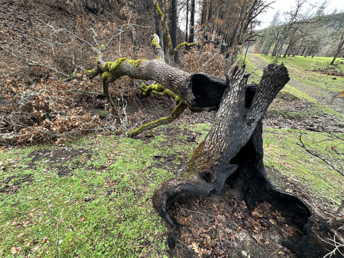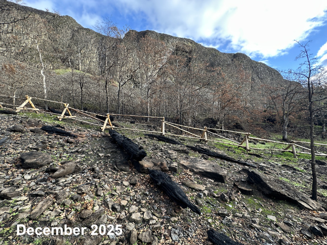 When I hike this trail, I see the handiwork of Trailkeepers of Oregon (TKO) crews everywhere, as TKOs volunteers have done much to rescue the trail in the aftermath of the 2017 fire. This includes a streamside section where a huge, post-fire logjam of killed trees accumulated just below Wahclella Falls, and piled so high they spilled onto the trail, itself. TKO and Pacific Crest Trail Association volunteers used a combination of saws and ropes to clear the way back in 2021, and today the logjam is still there to remind us of the power of this stream.