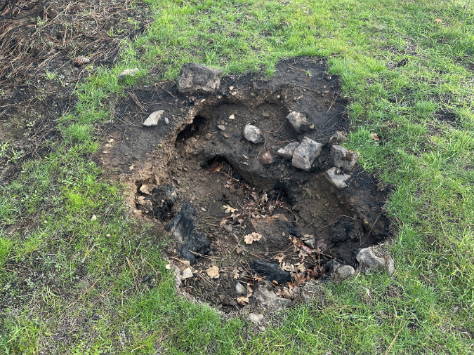 The Cooper Spur Shelter, itself, was also in need of some volunteer tending this year, as the stovepipe in the south corner of the structure has rusted through and that seems to have led to a collapse of the stone wall surrounding it (below).