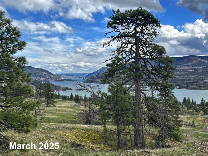 For the April image in the new calendar, I chose a scene that put April-blooming Balsamroot front and center. This view from the Columbia Hills State Historical Park (below) is looking west toward Mount Hood on a cool, blustery spring day.