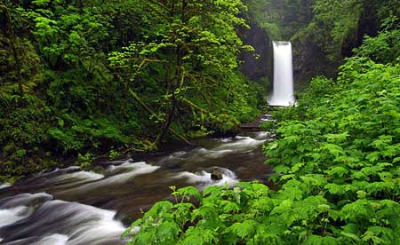 The restrooms, telephone, easy highway access and shady, un-crowded streamside picnic sites below lofty Starvation Creek Falls make this an ideal terminus for hikers seeking to relax after their adventure.