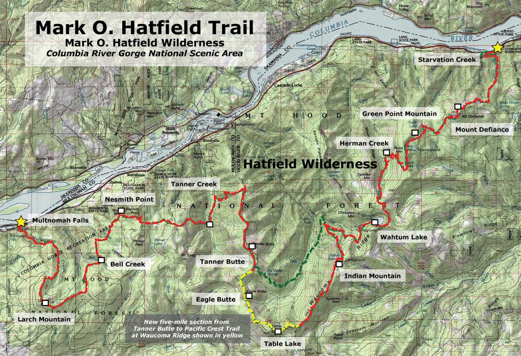 This Mark O. Hatfield Trail proposal is for a 60-mile memorial trail that spans the Hatfield Wilderness, beginning at Multnomah Falls and culminating at Starvation Creek Falls, passing through the most rugged, lonely country to be found in the Columbia River Gorge along the way. This new trail would join classic hikes like the Timberline Trail at Mount Hood and the Wonderland Trail at Mount Rainier as premier backpacking destinations of national prominence.