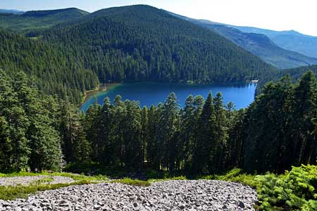 Day 3 to Table Lake: the third day of the proposed Hatfield Trail is a less challenging 9-mile hike along the high ridges of the Eagle Creek backcountry, allowing time for the spectacular side trip to Tanner Butte, along the way. The new trail segment begins north of Tanner Butte, and traverses across the rugged talus slopes and mountain tarns of Eagle Butte and Table Mountain, with expansive views into the Eagle Creek canyon, 3,000 feet below. The campsite for this proposed new segment is inside the Bull Run Reserve, at little-known Table Lake. Though the trail is inside the Bull Run boundary, the entirely of the trail is within the upper reaches of the Eagle Creek drainage, and is outside the physical watershed of the Bull Run.