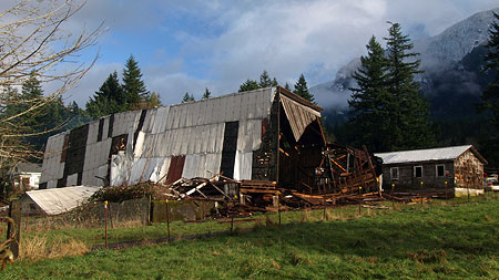 In recent years, the U.S. Forest Service and Oregon State Parks have been actively acquiring private land in proximity to the Bucher barn as part of implementing the long-term vision for the Columbia River Gorge National Scenic Area. According to the National Integrated Land System (NILS), these acquisitions may cover the Bucher barn parcel, which could explain the barn coming down, though I have not been able to verify this connection.