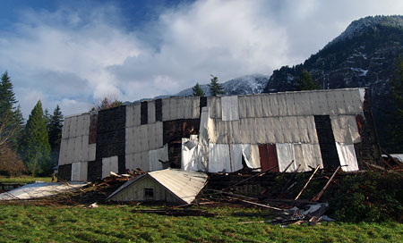 A series of early winter storms gripped the Gorge in late November and early December of this year, but the salvage work continues, and by mid-December, half the roof frame of the Bucher barn has been removed, along with most of the metal roofing.