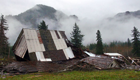 The barn was located in an area that made headlines in the winter of 1996, when a series of dramatic debris flows roared down from the Gorge rim and burst across I-84, closing the freeway for five days and destroying nearby homes — but sparing the barn. (click here for a full account of the debris flows)