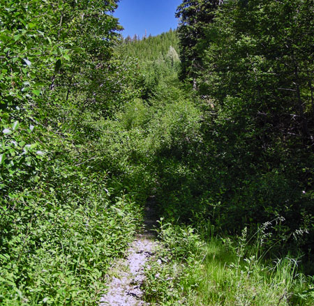 This messy section of “trail” is a reminder that road-to-trail conversions may seem an attractive bargain in the short run, but are often substandard for the outdoor experience they provide. Worse, over the long-term they can become brushy thickets of alder and willow, making them more costly to maintain than a traditional trail built under established forest canopy.