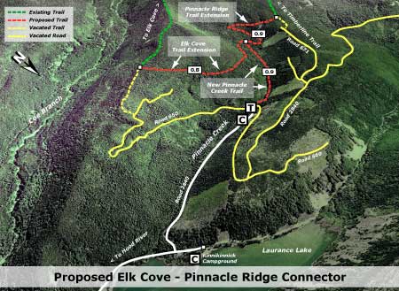 The new trail would also allow for eventual decommissioning of at least nine miles of deteriorating logging roads (shown in yellow on the maps that follow), as the new connector would provide access to both trails from the lower Elk Cove trailhead at Pinnacle Creek, on Forest Road 2840. In this way, the proposal not only provides an ecological net benefit in restoring the area from its logging heyday, but also pays for itself in reduced life-cycle costs for forest infrastructure.