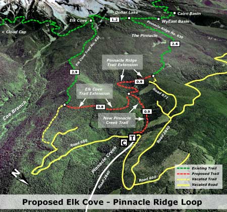 The second map (below) shows how the new connector trails would create a 9.3 mile Elk Cove to Pinnacle Ridge loop for day hikes and overnight trips, with campsites at Elk Cove, Dollar Lake and WyEast Basin. The new loop opportunity would not only make better use of the lightly used Elk Cove and Pinnacle Ridge trails, but also provide a north side access alternative to the very heavily used trailheads at Vista Ridge and Cloud Cap.