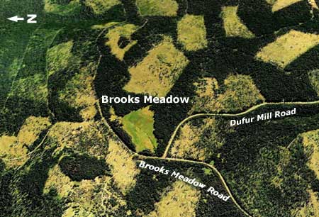 A closer view (below) of Brooks Meadow shows the abandoned road, and the dotted line of young trees that have begun to grow along the old roadbed. The location of the former guard station that once stood here is also shown.