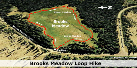 Brooks Meadow is located just off Forest Road 44, east of Mount Hood. Follow Oregon 35 from either Hood River or US 26 to the Forest Road 44 junction. Turn east, and follow Road 44 uphilll for several miles to the obvious intersection with Forest Road 17, where Forest Road 44 abruptly turns right. Continue straight at this intersection, onto Road 17, and immediately watch for a pullout just 100 yards from the intersection.