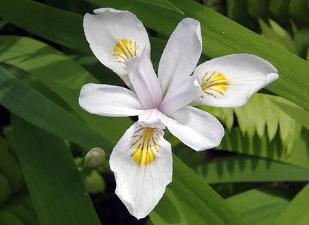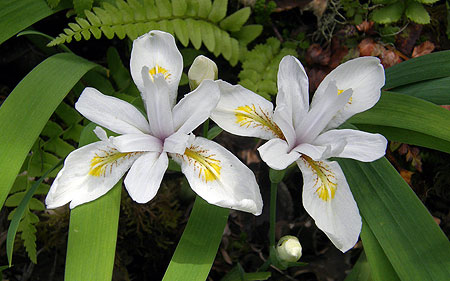 Along this section of trail, the fire has been especially beneficial to the rare Iris tenuis S. Watson, or Clackamas iris. This elegant wildflower occurs in both blue and white in its very narrow range. It is found along the Clackamas and Molalla Rivers, and nowhere else. These iris form beautiful drifts of white blossoms along the burned section of trail in late May and early June.