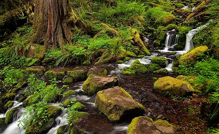 Continuing through the ancient forest, the trail passes the skunk cabbage bog before crossing the largest of several streams dropping into the ancient forest grotto — and take a look upstream, too: a nearly hidden waterfall leaps off the cliffs beyond the big trees.