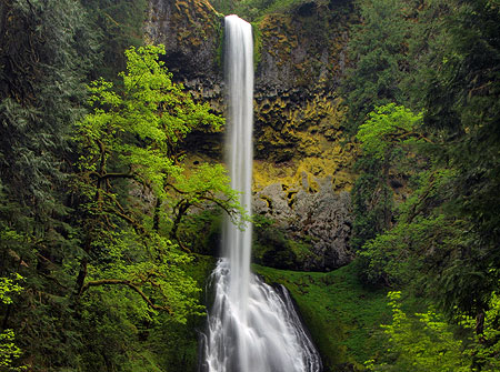The spur trail to the falls makes one quick switchback, but otherwise follows Pup Creek upstream to the dramatic amphitheater holding the 237-foot falls. In winter and early spring, the falls are particularly impressive, jetting a lot of spray to the small viewpoint at the end of the spur trail, so early season photographers should be prepared to battle the mist!