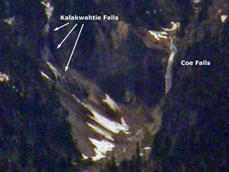 Pulling all of this together, the following is an oblique view of the north side region showing all of the waterfalls in context: Stranahan Falls on the Eliot Branch, Wallalute and Canon Ball falls on Compass Creek, and Kalakwhahtie and Coe falls on the Coe Branch.