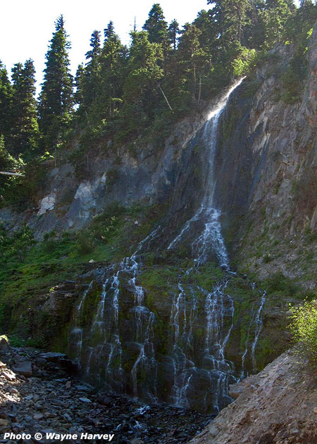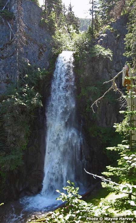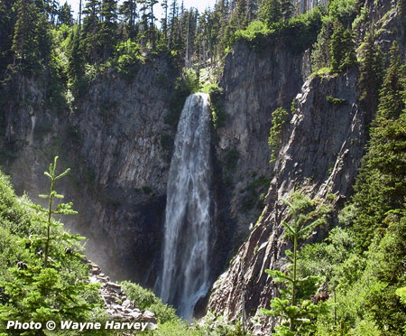 Stranahan Falls can be seen from Inspiration Point, but represents a potentially dangerous descent into a canyon that has been destabilized by recent floods. However, there are good views of the falls from a boot path that descends to a rocky overlook, just below Inspiration Point on the Cloud Cap Road.
