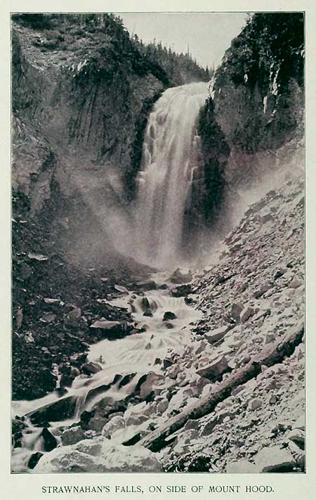 The mystery in this caption stems from the fact that USGS maps have long shown Wallalute Falls to be the prominent cascade on the Eliot Branch, just below Cloud Cap. This huge falls is visible from Inspiration Point on the Cloud Cap Road, and is clearly not the same as the cascade shown in the Grauer book.