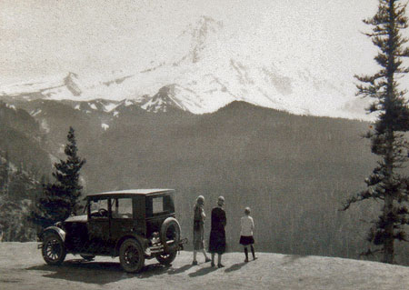 1920s Visitors to Cloud Cap taking in the view of Stranahan Falls (just to the right of the small tree in front of the car) and Mount Hood from Inspiration Point