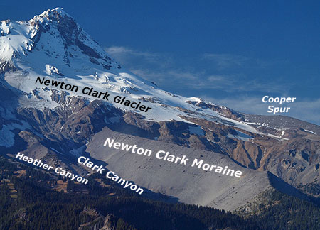 Most glacial moraines on Mount Hood are lateral moraines, formed along the flanks of glaciers, or terminal moraines formed at the end of a glacier. The Newton Clark Moraine is different: it is a medial moraine, meaning that it formed between two rivers of ice.