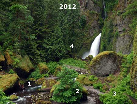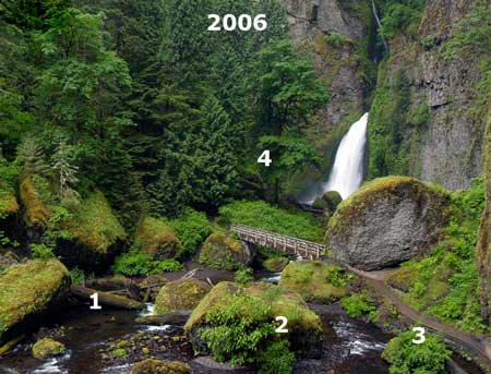 By contrast, the demise of the Wahclella maple is a very small change, indeed. But a closer look provides a glimpse into some of the more subtle changes that are part of the perpetually unfolding evolution this beautiful landscape. The following are nearly identical photos captured six years apart, in 2006 and 2012, and the changes over that short span are surprising: