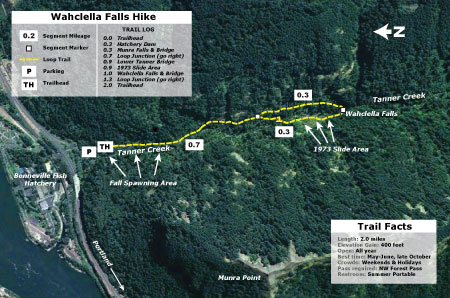The trail begins at a gate at the south end of the parking area, and initially follows a rustic gavel road to a small diversion dam that provides water for the Bonneville Fish Hatchery. From here, the route crosses a footbridge in front of Munra Falls, and becomes a proper hiking path. Head right (downhill) at a fork in the trail 0.7 miles from the trailhead to begin the loop through the towering amphitheater surrounding Wahclella Falls, then retrace your steps 0.7 miles to the trailhead after completing the 0.6 mile loop portion of the trail. Enjoy!