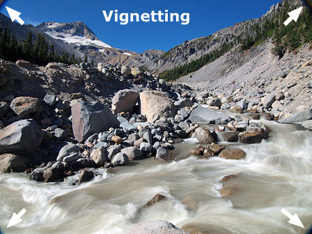 Too many stacked filters left vignetting in the corners of this image of Newton Creek and Mount Hood