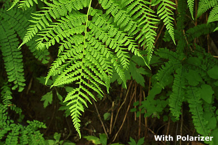 A more dramatic difference is clear in this pair of images showing the glossy leaves of deer fern with and without a polarizer: