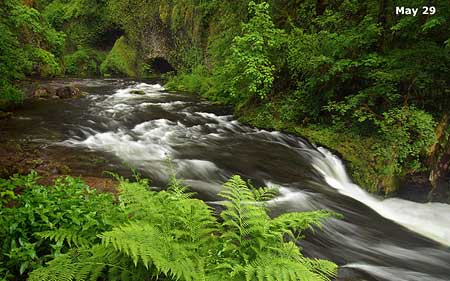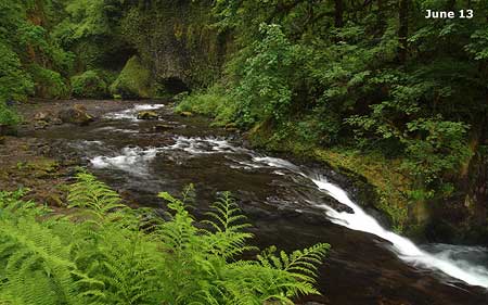 The following pair of images taken along Eagle Creek in the Columbia Gorge shows the same scene under heavy overcast (May 29) and two weeks later, under bright overcast (June 29):