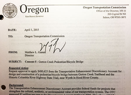 It turns out the money has always been there, too. On April 1, ODOT quietly pulled nearly a half-million dollars in “contingency” funds into this latest phase of the state trail as a consent item before the Oregon Transportation Commission. The new money is for a previously unplanned bridge over nearby Gorton Creek, a worthy addition at the east end of the current phase of construction. Warren Falls could be restored for a fraction of that amount – if only the will and sense of agency responsibility at ODOT existed.