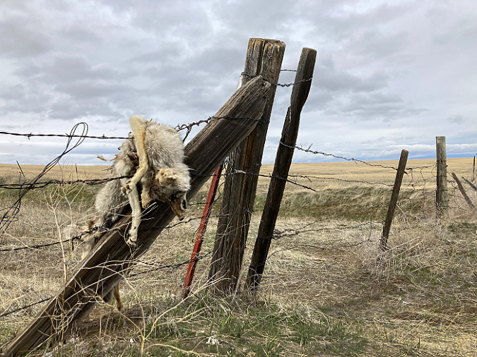 Killed coyote strung up on a fence along Center Ridge Road in Wasco County this winter